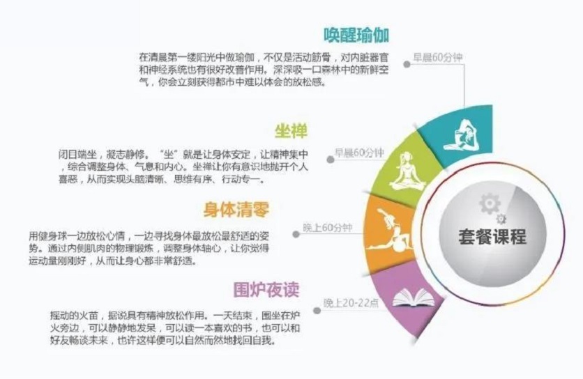 套餐課程:適用于所有到訪游客,根據(jù)住宿時(shí)間長(zhǎng)短,基地會(huì)提供相應(yīng)的健康管理課程,包括“坐禪、喚醒瑜伽、圍爐夜讀、健身球放松活動(dòng)”等,套餐課程一般安排在早晚進(jìn)行:早晨是心理調(diào)節(jié)課程、晚上是生理調(diào)節(jié)課程,時(shí)長(zhǎng)基本為一小時(shí)左右(圍爐夜讀課程為兩小時(shí))。