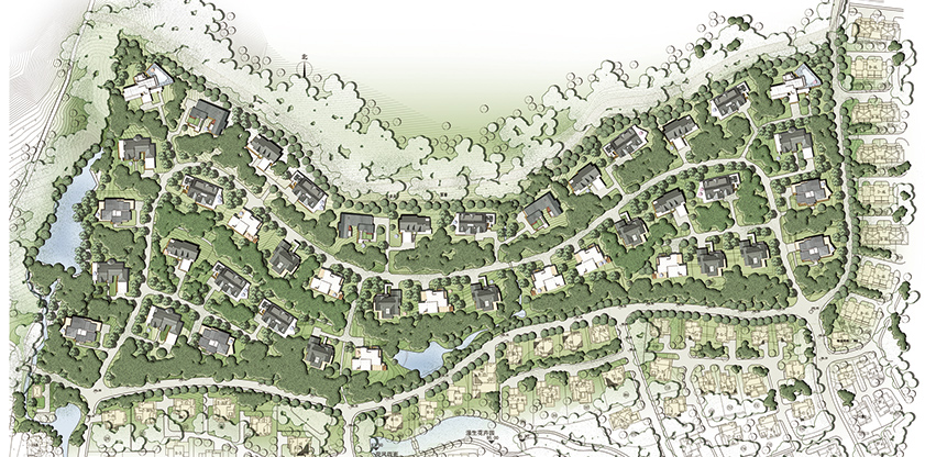 大面積的景觀綠化,加之大面積的天然活水塘使居住的環(huán)境品質得以提升。以原始地形、地勢為依托,尊重天然的基地景觀特點,通過建筑與基地的互補關系,進行微地形改造處理。每種戶型均有與之適應的一組相似地塊,使土方開發(fā)量保持最低,使人們在生活中自覺地感受山地帶來的無窮樂趣。